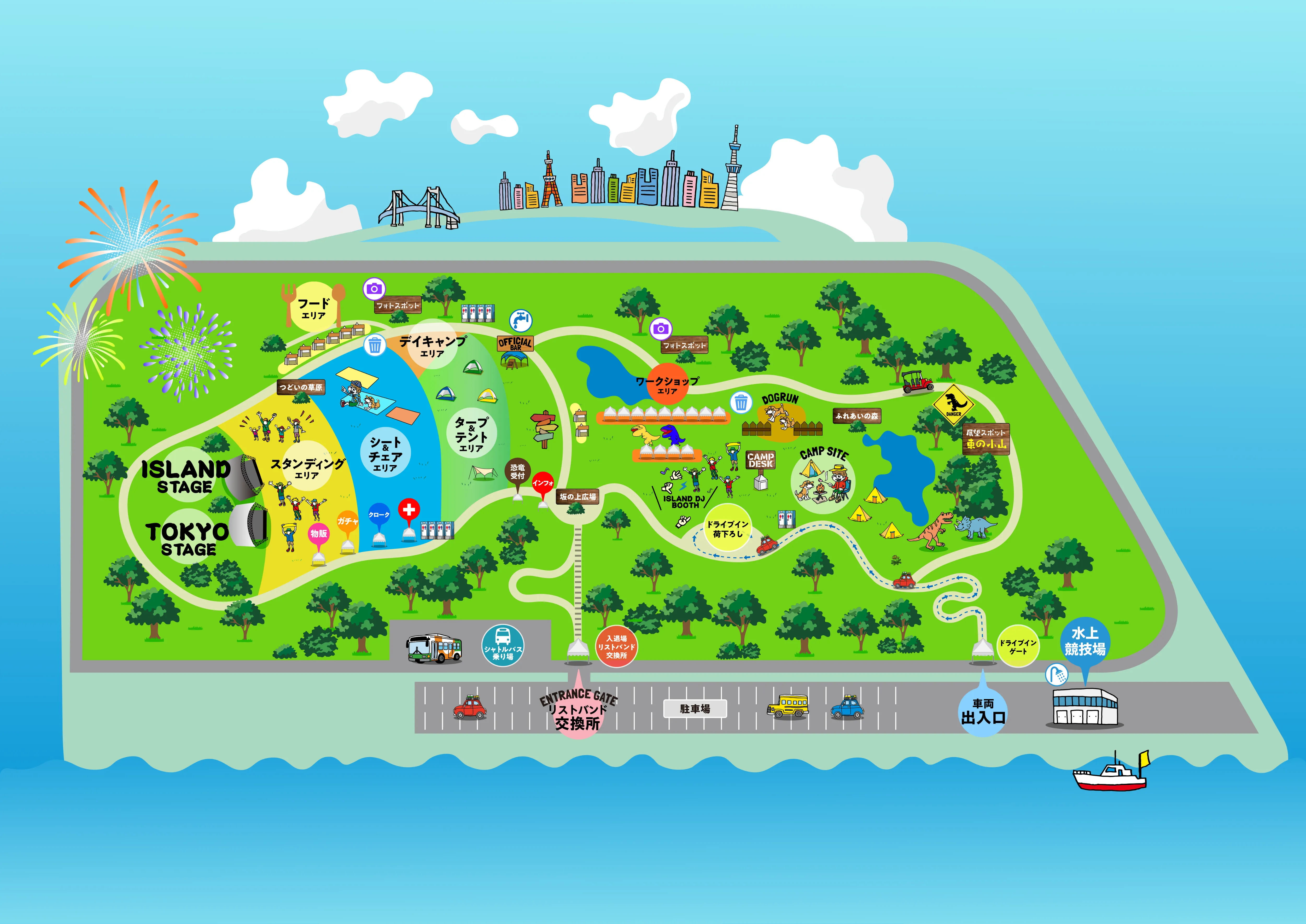 観覧エリアは前方より、「スタンディングエリア」「シート&チェアエリア」「タープ&テントエリア」「デイキャンプエリア」に分かれております。ご自身のスタイルに合った場所でお楽しみください。※デイキャンプエリアはチケットが必要(有料)です。車で来場することはできません。