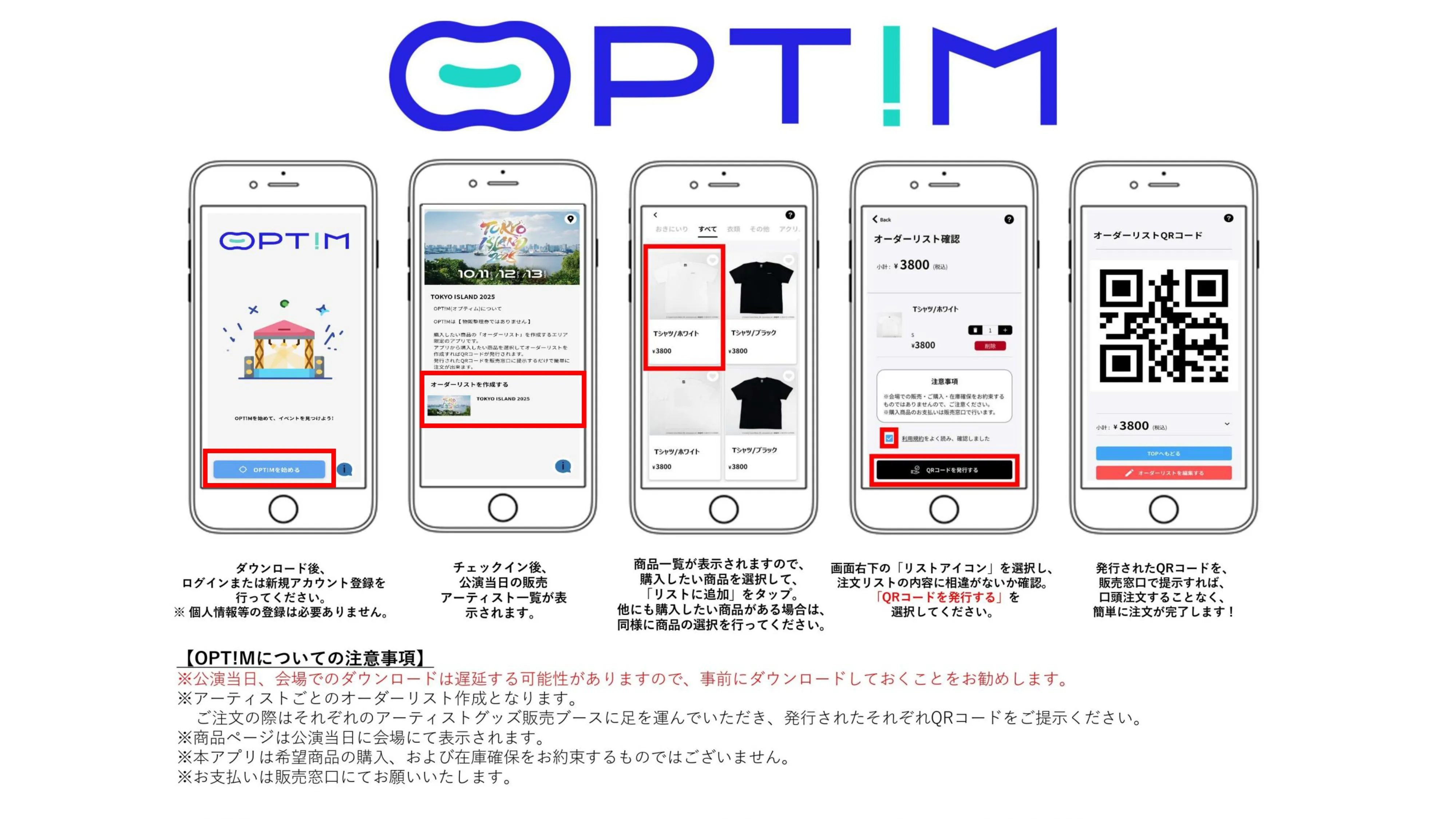 公演当日、スムーズにグッズ販売がご利用いただけるよう、スマートフォンのアプリよりグッズオーダーリストが作成できる「OPT!M(オプティム)」を今年も導入します。
