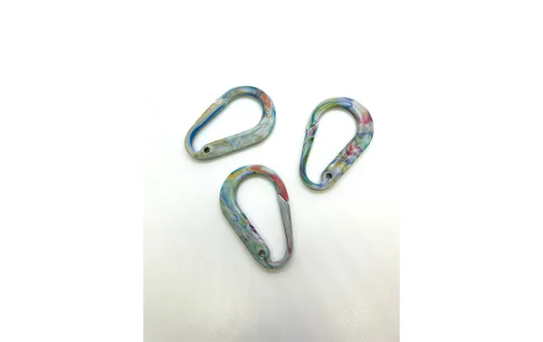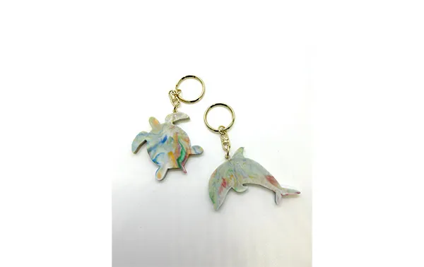 廃プラスチックでオリジナルグッズ作りペットボトルキャップなどの廃プラスチックをアップサイクルしてオリジナルのマーブル模様のキーホルダーなどを作ります。