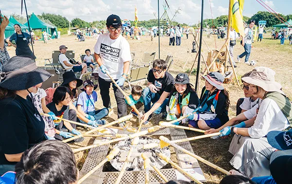 親子で楽しめる竹のジャングルジムなどの遊具をはじめ、イラストレーター・ウシオダヒロアキと一緒に創るアウトドア・アート・ワークショップ、大人気の「焚き火カフェ」や「ねじねじパン作り」など体験型のワークショップが勢ぞろい!