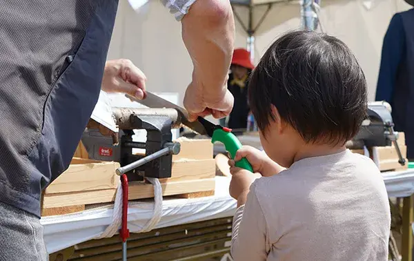 木こり体験・コースターづくり海の森を育てるために、木を切ることも大切です。海の森の整備で発生した木材をつかい、木を切ってコースターにします。コースターは持って帰れます。